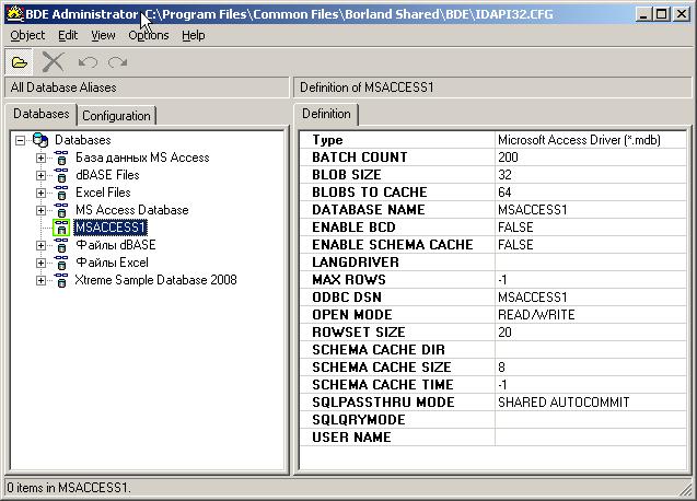 В окне BDE Administrator выберите пункт меню Object – New и создайте новый псевдоним (Alias), указав драйвер Microsoft Access Driver, затем укажите его имя (мы назвали его MSACCESS1).
