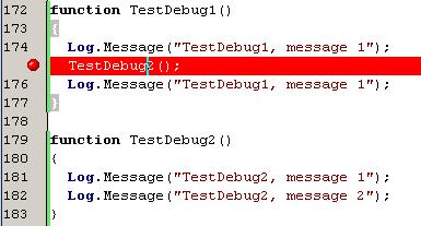 Если теперь запустить функцию TestDebug1, то ее выполнение будет приостановлено непосредственно перед вызовои функции TestDebug2, а в панели закладок появится новое окно Pause Log, в котором находится лог текущего работающего скрипта.