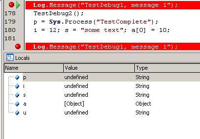 Поставьте брекпоинты на строках Log.Message и запустите функцию. После остановки на первом брекпоинте обратите внимание на нижнюю часть окна TestComplete, где находятся вкладки Call Stack, Locals, Watch List и Breakpoints.