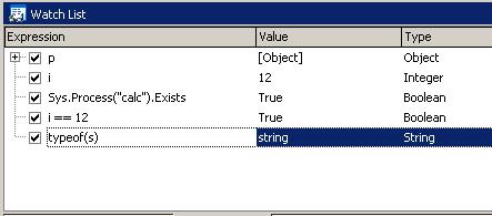 Теперь перейдите на вкладку Watch List. Здесь вы можете как смотреть значения любых переменных (локальных и глобальных), так и вычислять целые выражения. Ниже показан пример проверки существования процесса и нескольких переменных.
