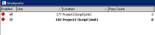 Теперь поставим точку прерывания в функции TestDebug1 на строке вызова функции TestDebug2. Для этого необходимо щелкнуть мышью на этой сроке и нажать клавишу F9. После этого строка станет красной.