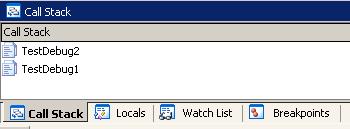 На вкладке Call Stack отображается порядок вызова вложенных функций. Например, в нашем случае, если остановить выполнение скрипта в середине функции TestDebug2, то мы увидим, что первой была вызвана функция TestDebug1, а затем из нее TestDebug2.