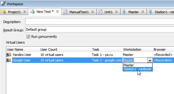 Дальше нам необходимо указать, какие тесты будут использовать добавленную рабочую станцию. Для этого откроем любой тест (New Test в нашем проекте) и укажем для каждого виртуального пользователя, на какой станции выполнять нагрузочный тест.