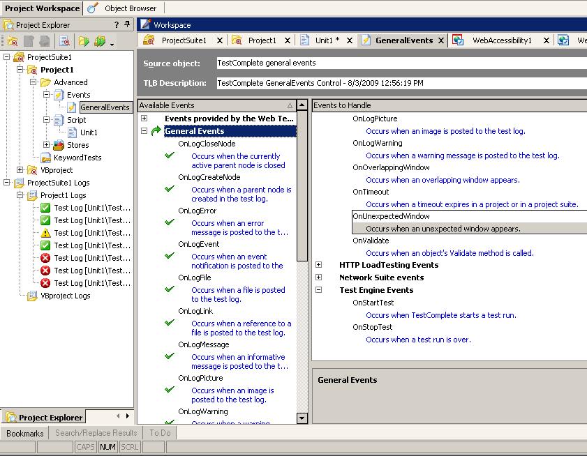 Группа General Events самая большая, здесь содержатся события, связанные с логом TestComplete: OnLogCloseNode, OnLogCreateNode, OnLogError, OnLogWarning и т.п.. Здесь же находятся события, связанные с появлением неожиданных для TestComplete окон (OnOverlappingWindow и OnUnexpectedWindow), OnTimeout – возникает когда истекает время, отведенное для работы скриптов.