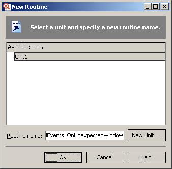 Так как у нас нет сейчас отдельного модуля, мы его создаем с помощью кнопки New Unit, а затем жмем ОК в окне New Routine. При этом в модуле _Events у нас появляется функция-обработчик события OnUnexpectedWindow: