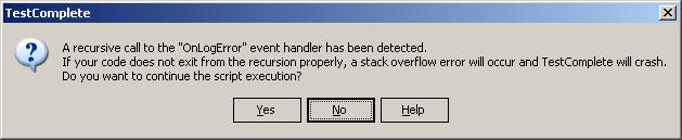 Второй. Это реальная ситуация, время от времени возникающая в TestComplete. При работе с некоторыми нестандартными элементами управления (в частности с элементами управления Infragistics), иногда TestComplete генерировал ошибку “Improper command”. Это случалось потому, что при обработке действий пользователя эти контролы, как кажется TestComplete-у, перестают отвечать на запросы, хотя на самом деле они прекрасно работают. В результате после прогона скриптов мы имеем десяток ошибок “Improper command”, хотя все скрипты отработали правильно. Для решения подобной проблемы мы можем перехватывать событие OnLogError и проверять текст ошибки. Если это наш “Improper command” – то мы попросту игнорируем такую ошибку, в противном случае ошибка заносится в лог как обычно.