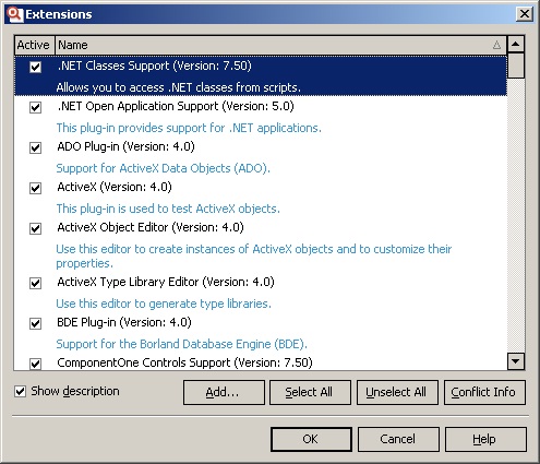Большинство возможностей в TestComplete реализовано с помощью надстроек (Extensions). Например, работа с ADO, поддержка .NET приложений, пользовательские формы и многое, многое другое – всё это реализовано с помощью надстроек (или плагинов – plug-ins). Чтобы посмотреть полный список установленных надстроек, необходимо в TestComplete выбрать пункт меню File – Install Extension… При этом на экране отобразится окно Extensions.