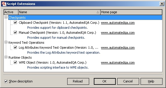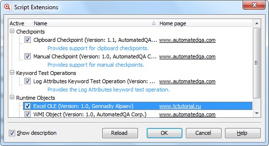 Затем зайдите в TestComplete в меню File – Install Script Extension, нажмите кнопку Reload и включите чекбокс напротив имени подключенной надстройки.