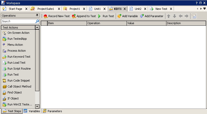Давайте для начала создадим простой KD Test. Для этого необходимо щелкнуть правой кнопкой мыши в проекте на элементе KeywordTests, выбрать пункт меню Add – New Item и в появившемся окне Create Project Item ввести имя нового теста (например, KDT1). После чего в окне TestComplete откроется панель KD Test.