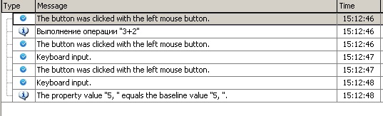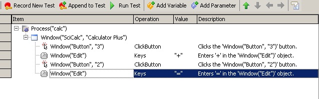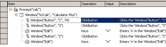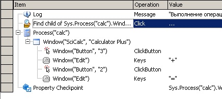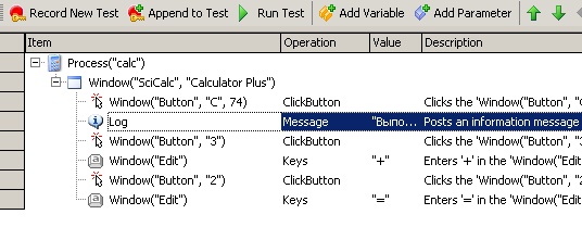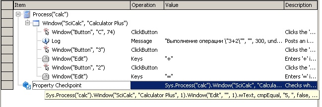 В колонке Item отображается имя объекта, с которым производится действие, в колонке Operation – производимая операция (например, ClickButton – нажатие на кнопку), в колонке Value – параметр операции (например, имя кнопки в нашем случае) и в колонке Description – описание операции.