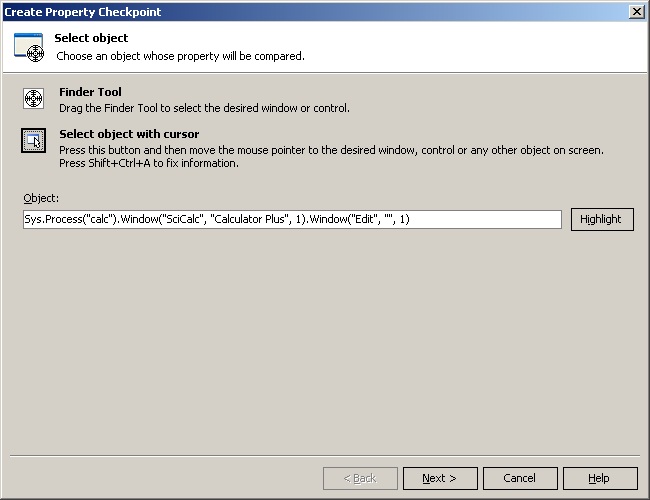Аналогичным образом с использованием мастера добавляются и другие элементы скрипта. Например, в следующем примере мы вставим проверку значения в текстовом поле Калькулятора после того, как выполним действия. Для этого мы используем чекпоинт Property Checkpoint.