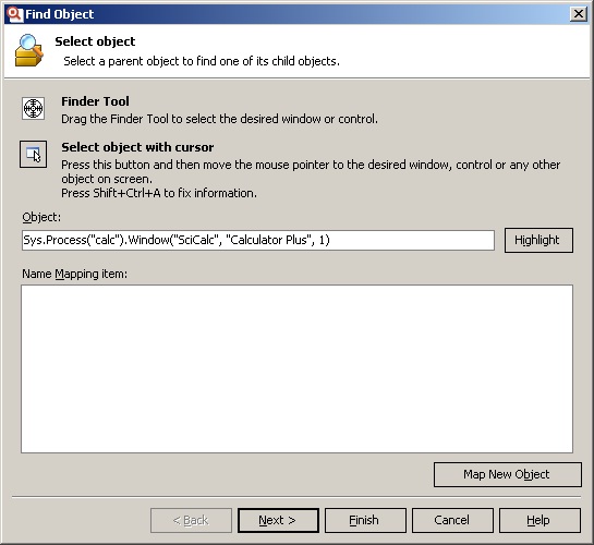 С помощью инструмента Finder Tool выделим родительский элемент, чьим потомком является кнопка (в нашем случае это главное окно Калькулятора) и нажмем Next.