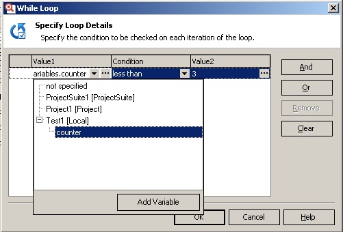 Для добавления переменной необходимо перейти на вкладку Variables, щелкнуть правой кнопкой мыши по списку и выбрать пункт меню New Item. Затем выбрать для появившейся переменной имя, тип и значение по умолчанию. Затем эту переменную можно использовать в KD Test-ах. Например, ниже показан пример цикла while, который исполняется до тех пор, пока переменная counter не достигнет значения 3. Чтобы этот цикл не был бесконечным, мы поместили в него инструкцию, увеличивающую значение переменной на единицу во время каждого прохода цикла.