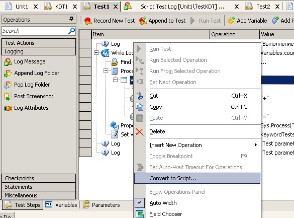 Для того, чтобы сконвертировать KD Test в обычный тест, достаточно открыть его, щелкнуть в любом месте теста правой кнопкой мыши и выбрать пункт меню Convert to Script