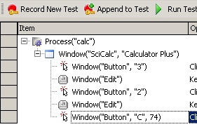 Предположим теперь, что вы хотите очищать поле результатов Калькулятора перед тем, как начать выполнять операции, для чего первым действием хотите нажимать кнопку C (Cancel). Для добавления действий в существующий тест предназначена кнопка Append to Test панели инструментов. После нажатия на эту кнопку вы опять переходите в режим записи, записываете необходимые действия и они добавляются в конец существующего скрипта.
