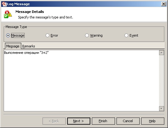 Здесь мы указываем, какой тип сообщения мы хотим использовать (Message, Error, Event, Warning), а также основной и дополнительный текст (Message и Remarks).