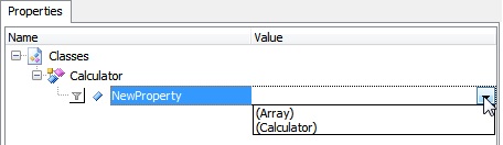 В колонку Value можно ввести какое-то значение напрямую (строку, число, true/false) или выбрать значение (Array), чтобы создать переменную типа массив. Мы назовем это свойство Result и не будем сейчас присваивать ему никакого значения. Это свойство будет в дальнейшем использовано для хранения результата вычислений.