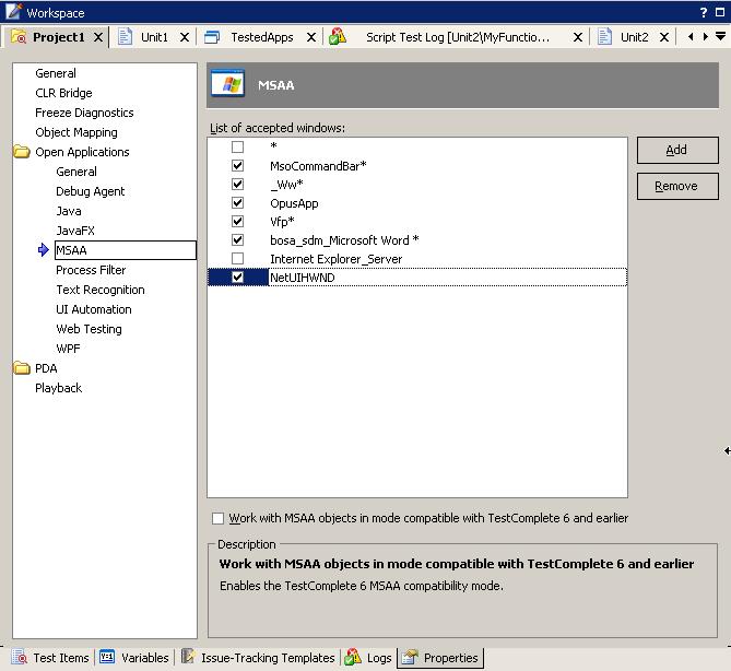 MSAA – это технология, позволяющая сторонним приложениям получать информацию о внутреннем устройстве приложения. Если в вашем приложении используется технология MSAA, это даст вам больше возможностей при работе с ним. В частности технология MSAA используется во всех приложениях Microsoft (например, MS Office). Для того, чтобы включить поддержку MSAA для какого-либо элемента управления, необходимо добавить имя его класса в раздел Open Applications – MSAA.