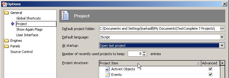 Кроме того, в окне Options (Tools – Options) в разделе General – Project можно указать язык, который будет использоваться по умолчанию при создании нового проекта (Default language), папку для размещения проектов (Default project folder) и действие при открытии TestComplete (At startup) – открыть последний проект, открыть стартовую страницу или не открывать ничего.