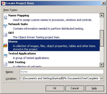 Прежде, чем начать работать со Stores, необходимо добавить соответствующий элемент в проект TestComplete. Для этого щелкнем правой кнопкой мыши на имени проекта, выберем пункт меню Add – New Item и в появившемся окне Create Project Item выберем Stores.