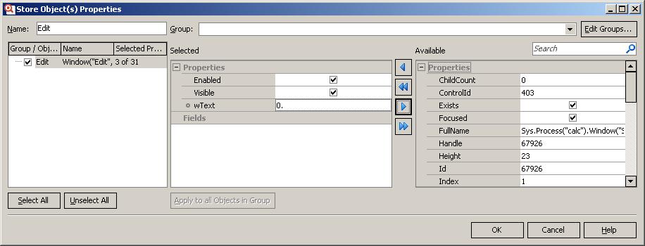 Нажимаем Next, затем Edit и у нас появляется окно Store object(s) properties, где мы можем выбрать свойства, по которым будет выполняться проверка объекта. Если перед нажатием на Edit выбрать галочку Store properties of child objects, и в нашем контроле есть дочерние объекты, то нам будут предложены для проверки все объекты, которые находятся внутри проверяемого.