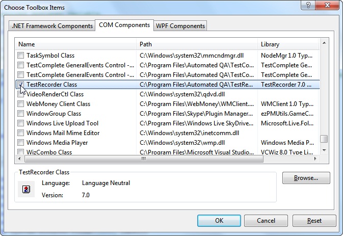 Прежде всего добавим новый компонент на панель инструментов (меню Tools – Choose Toolbox Items, вкладка COM Components, компонент TestRecorder Class).