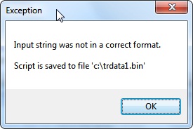 MessageBox.Show(ex.Message + “\n\n” + @”Script is saved to file ‘c:\trdata1.bin'”, “Exception”);