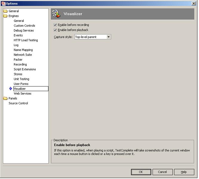 Чтобы включить Визуализатор, необходимо открыть настройки TestComplete – Tools – Option – Engines – Visualizer и в открывшейся панели Visualizer включить чекбоксы Enable before recording и Enable before playback. Это заставит TestComplete делать снимки экрана как при записи, так и при воспроизведении (но не каждый раз, а только лишь в том случае, если новый объект отличается от предыдущего).