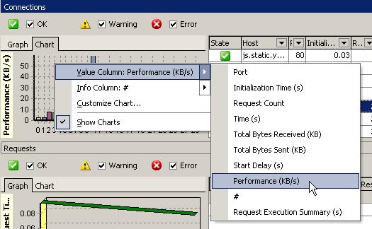 В таблице Connections отображается очень много информации по каждому подключению (например, время, количество переданных и полученных байт, производительность и т.п.), поэтому заголовки столбцов трудно прочитать. Внимательно посмотрите, возможно некоторые из колонок вам не нужны, тогда их можно скрыть, щелкнув правой кнопкой мыши на заголовке таблице и выбрав пункт Field Chooser. - Панель запросов. В этой панели можно посмотреть подробную информацию по каждому запросу выбранного подключения.