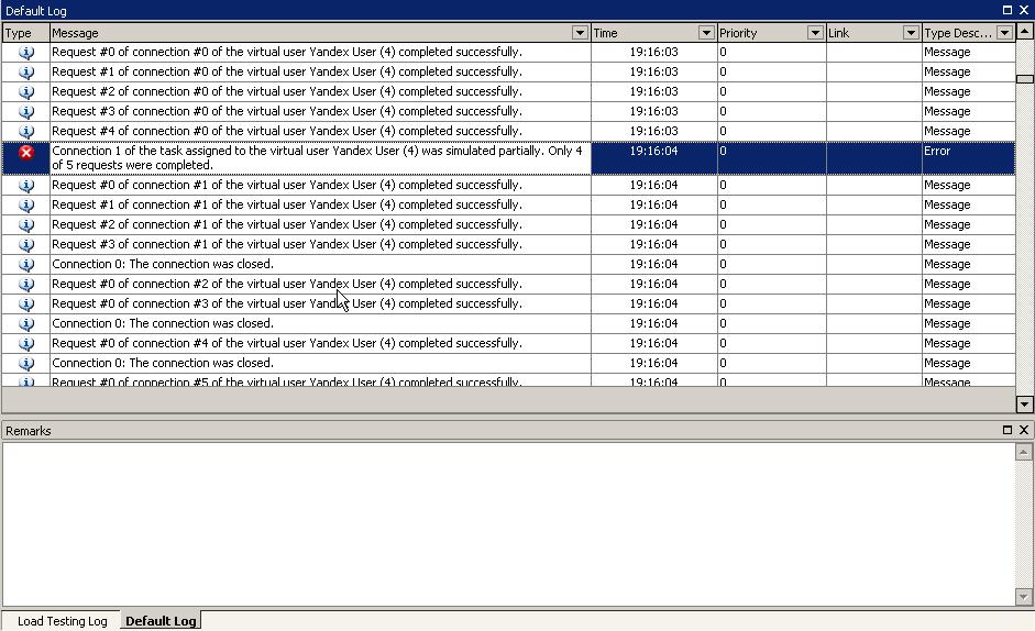 Рассмотрим внимательно вкладку Load Testing Log. Здесь находятся три панели: