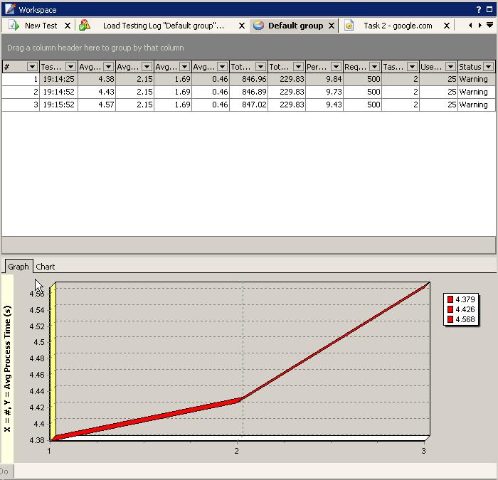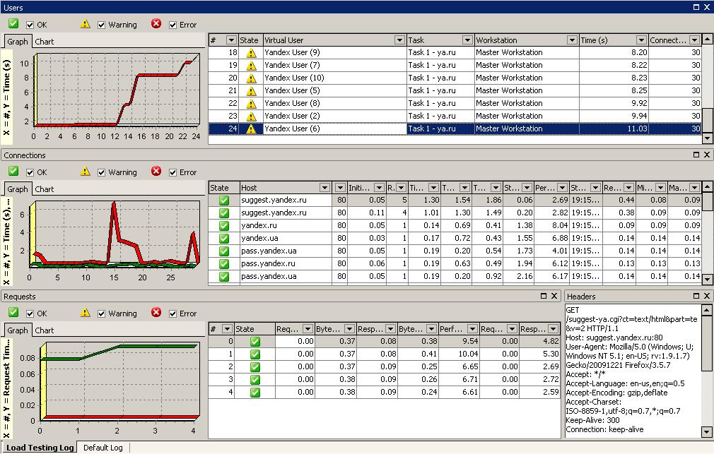 В таблице справа от графика можно посмотреть, какую задачу выполнял каждый пользователь, сколько в точности времени понадобилось каждому пользователю времени и сколько подключений они сделали за время выполнения теста. Например, из результатов, показанных выше, видно, что на выполнение запросов к Гуглу тратилось от 1 до 4 секунд, а на запросы к Яндексу – от 8 до 11 секунд.