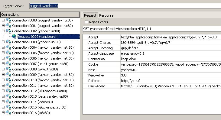 В правой части панели отображаются 2 вкладки – Request (Запрос) и Respond (Ответ). Это запросы и ответы для выбранного в списке слева подключения. Галочка Raise Events на каждой вкладке позволяет включить генерацию OnLoadTestingRequest и OnLoadTestingResponse события соответственно. По умолчанию генерация этих событий отключена в TestComplete, так как включение этого события для всех подключений может существенно замедлить выполнение скриптов.