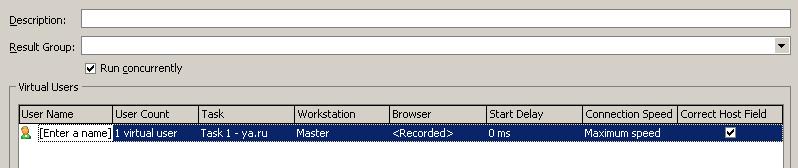 В каждом тесте может быть несколько пользователей (поле User Name), каждый из которых в свою очередь может запускать сразу несколько экземпляров нагрузочного теста (количество одновременных запусков определяется полем User Count, а задача – полем Task). Также для каждого пользователя можно указать компьютер, который будет использоваться для запуска записанного трафика (поле Workstation), браузер, который будет использоваться при эмуляции (Browser), задержка старта в миллисекундах (Start Delay), скорость подключения (Connection Speed), а также указать, необходимо ли для данного пользователя исправлять Host Field (если галочка включена, то Host Field будет заменяться на значение из поля Target Server).