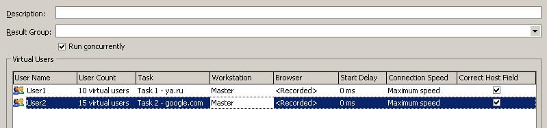 Обратите внимание на опцию Run Concurrently в окне нагрузочного теста. Если эта опция включена, то при запуске этого нагрузочного теста все задачи виртуальных пользователей будут запускаться одновременно, а если опция выключена – то задачи будут запущены по очереди.