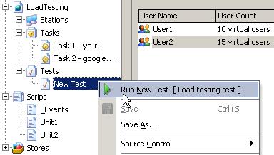 В следующем примере мы создадим 5 виртуальных пользователей, каждому из которых назначим задачу (Task) и нагрузочный тест (Test, который также будет создан в скрипте), а затем запустим созданный нагрузочный тест, одновременно назначив ему группу (чтобы можно было сравнивать результаты прогона тестов).